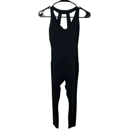 Athleta Transcend V-Neck Bodysuit Black Strappy Back Yoga Jumpsuit XS 530635