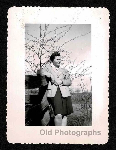 WOMAN LADY SKIRT JACKET POSING RUSTIC FENCE TREE OLD/VINTAGE PHOTO- E393