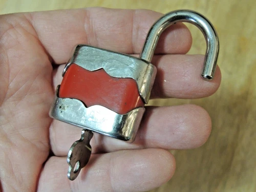 Vintage Trelock Padlock Small Lock, Luggage w/ Key Red Enamel & Chrome, Works!