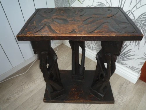 VINTAGE ANTIQUE COFFEE TABLE WOODEN TRIBAL FIGURES HAND CARVED ETHNIC AFRICAN