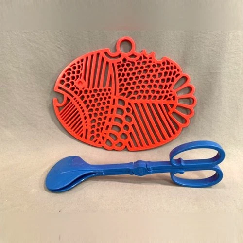Vintage Dansk Kitchen Lot - Red Fish Trivet by Gunnar Cyrén + Blue Melamine Tong