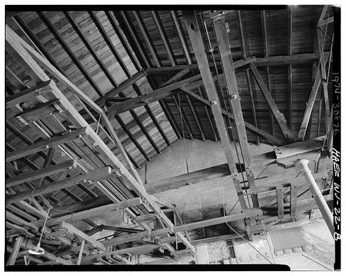 8. MACHINE SHOP, INTERIOR, LOOKING ROOF TRUSS SYSTEM. NOTE DECORATIVE WOOD