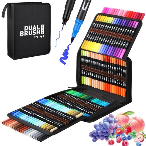 120 Colour Dual Tip Brush Pens Fineliners Colouring Watercolour Markers Drawing