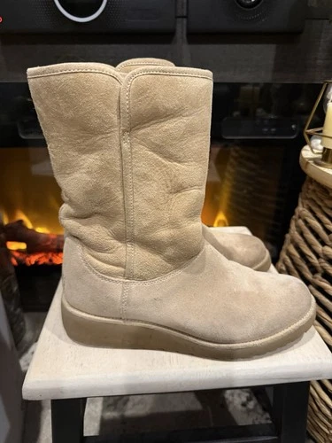 UGG Shearling Suede Mid-Calf Boots Beige Lined Pull-On Round Toe Women's 7.5