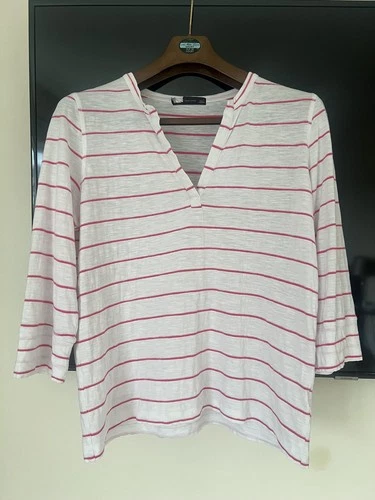 M&S T-shirt Top, 3/4 Sleeve. White with pink stripes. Size UK 14