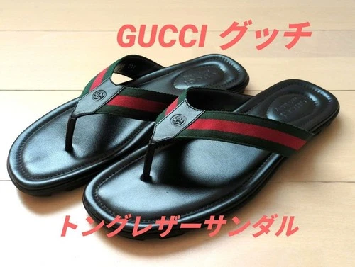 Auth GUCCI Men's GG Thong Sandals Black EU44 US10.5 UK10 Leather Logo Flat