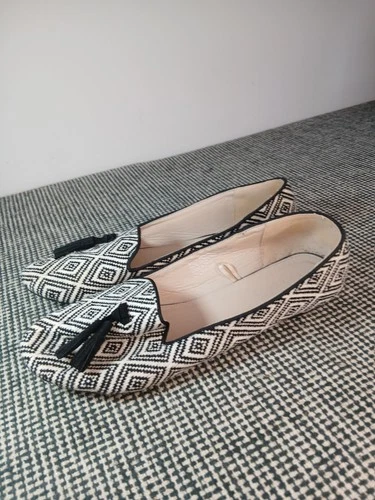 Ladies Tassle Slip On Shoe Size 6 UK EU 39 Black White Pattern Flat Shoes