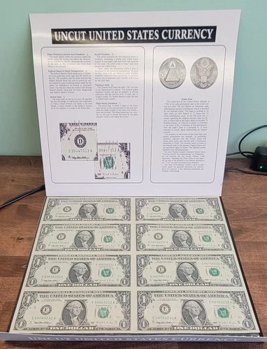 1995 Uncut Sheet of 8 $1 Bills Currency Bureau of Engraving and Printing EX Cond