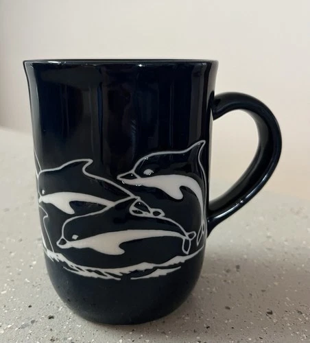 Artisan Made Vintage Navy Dolphin Enameled Cup Mug 4” Tall Up To 12oz Capacity