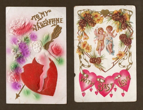Set of 2 Early 1900s Valentines Day Postcards, 1910, Embossed, Metallic Gold
