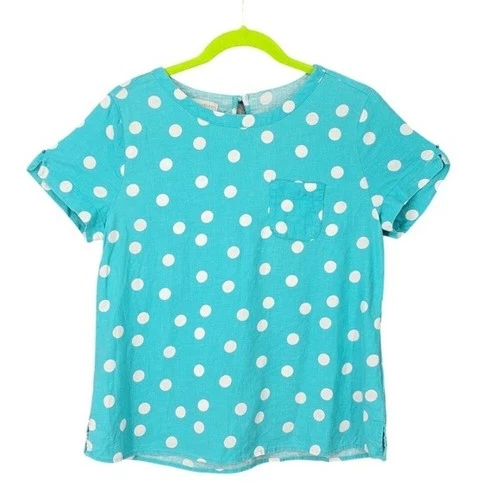 Van Heusen Blouse Womens Medium Blue White Polka Dot Linen Blend Short Sleeve