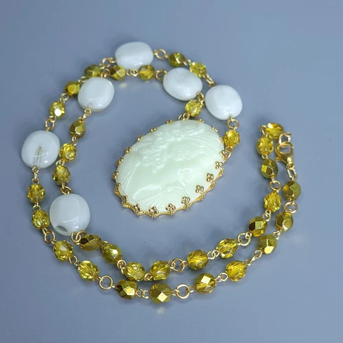 Uranium Glass Cameo Pendant Necklace 22" Vaseline Czech Beads Women`s Jewelry