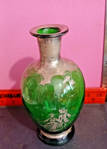 Vintage Mid-Century Murano Emerald Glass Vase Silver Overlay Courting Couple