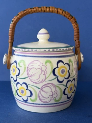 Vintage Poole Pottery biscuit barrel with wicker handle shape 630 pattern JL