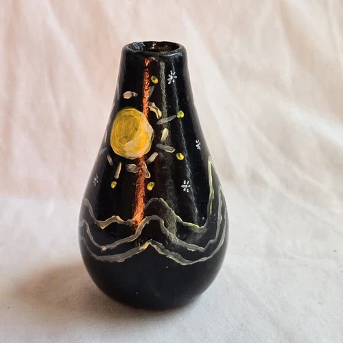 Hand Painted Folk Art Bud Vase Mountain Moon Night Scene Black Rustic Decor 5”