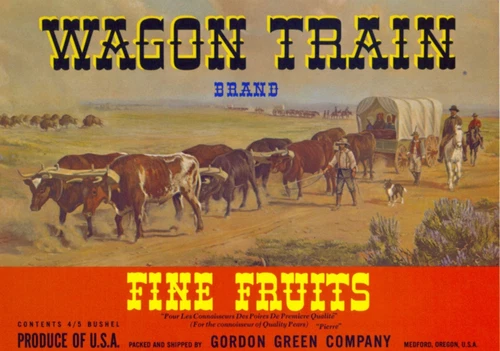 Original WAGON TRAIN pear crate label Gordon Green Company Medford Oregon red