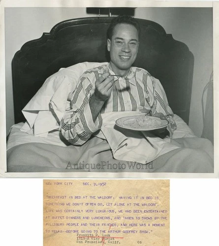 Waldorf Hotel NY F. Zook eating in bed vintage photo