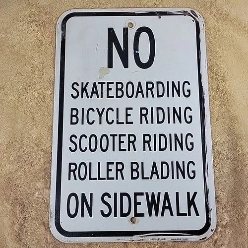 VTG NO Skateboarding Bicycle Roller Blading... On Sidewalk Sign Heavy Metal