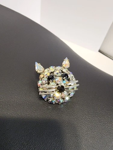 Vintage Warner Aurora Borealis Rhinestone Cat Pin Kitty Brooch