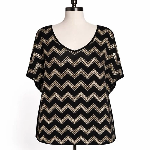 Torrid Black w Gold Sequin Chevron Dressy Blouse Short Sleeve Plus Sz 0 (Large)
