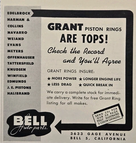 Bell Auto Parts Bell CA Grant Piston Rings Navarro Weiand Vintage Print Ad 1951