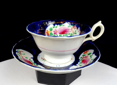 Gaudy Welsh Staffordshire Porcelain Columbine 2 1/4" Cup & Saucer Set 1850s