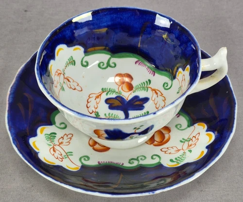 British Gaudy Dutch Welsh Red Floral Ocher Cobalt & Luster Tea Cup & Saucer