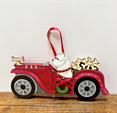 Westie Red Car Roadster Christmas Ornament West Highland Terrier Painted Wood 5"