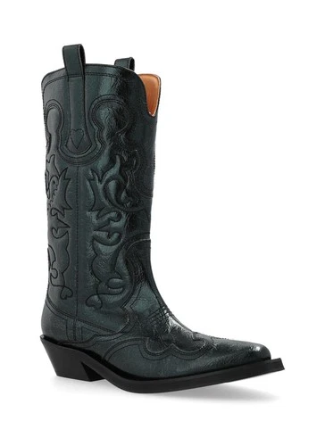 NEW GANNI Topstitch Detail Mid Shaft Embroidered Western Boot Climbing Ivy 37 EU