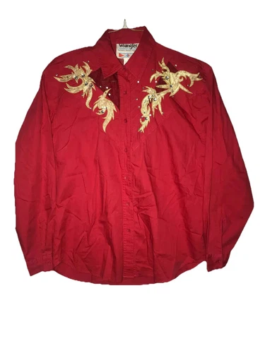 Vintage WRANGLER Western Show Shirt Red Gold Cowgirl Rhinestones Size L