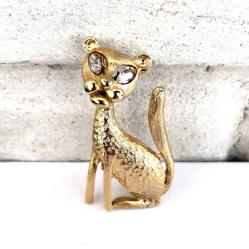 Vtg Cat Cougar Gold Tone Pin Brooch 2” Long Marquis White Crystal Eyes Textured