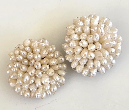 Vintage Genuine Rice Freshwater Pearl Cluster Clip Earrings 7/8"