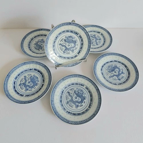 Vintage Chinese Rice Grain Pattern Porcelain 6 Plates Small Blue White Dragon VG