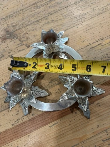VTG Metal Holly Leaf 3 Taper Candle Holder Ring Christmas Silver Tone