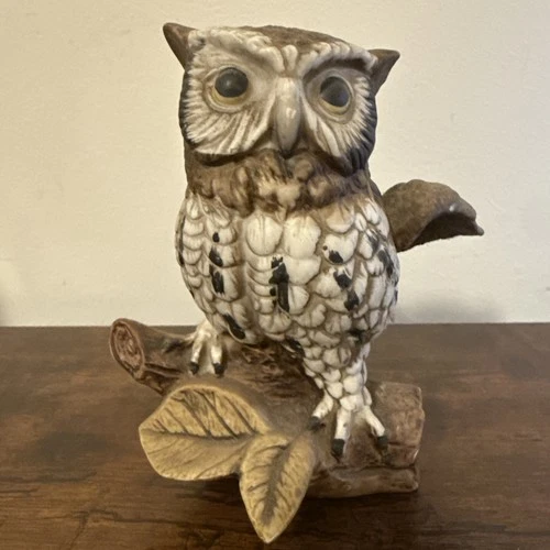 Horned Owl Vintage HOMCO Perched On Branch Porcelain 1970's Brown