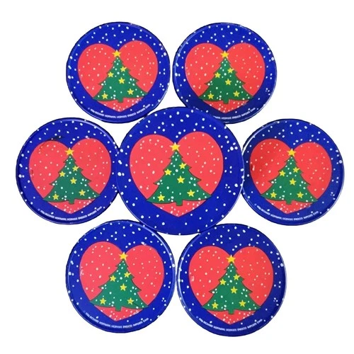 Vintage Enesco Christmas Tree Tin Coasters Cork Backs Set Of 6 Holiday Food 1986