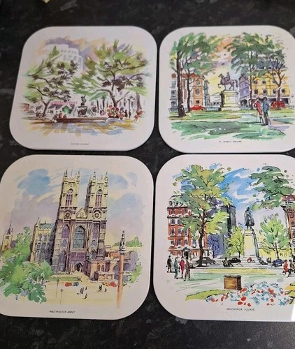 Vintage 60's Puillery Metal Cork Trivet Hot Pad London Scenes X 4. Slowness Squa