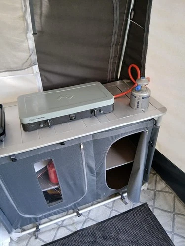 TectakeCamp Kitchen With Four Shelves And Sink With Cadac Pro 3 Cooker With Gas