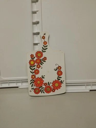 vintage 1970s wooden or melamine cutting board decorated with a bold, orange...