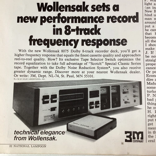 Wollensak 8 Track Tape Deck Print Ad Original Vintage 1974 3M St. Paul MN