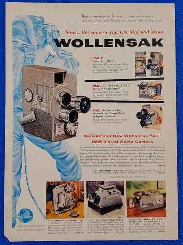 1957 WOLLENSAK "43" 8MM TURRET MOVIE CAMERA ORIGINAL COLOR PRINT AD WORLD FAMOUS