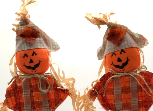 Halloween 2 Cloth Jack O Lantern Pumpkin Scarecrows Wooden Stands Greenbrier #2
