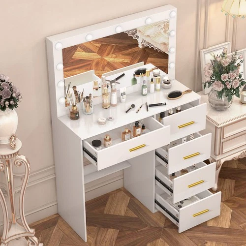 Dressing Table with 5 Drawers 11 LED Mirror Dresser Makeup Desk Vanity Set White