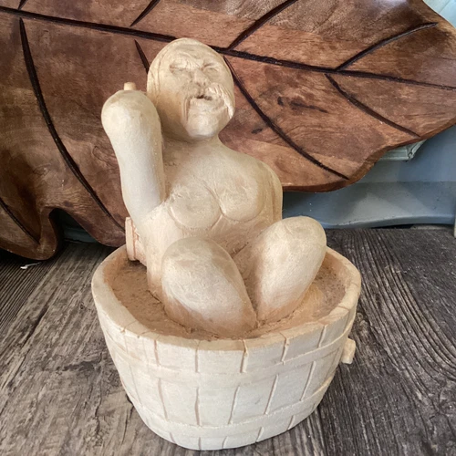 Carved Man In Tub Wood Barrel Light Weight Wood Figurine 5”
