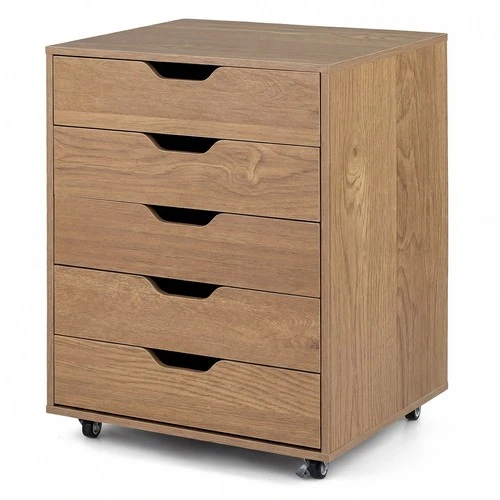 5 Drawer Filing Cabinet on Wheels Wooden Storage Cabinet with Lockable Natural