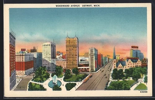 Postcard Detroit, MI, Woodward Avenue with skyscrapers