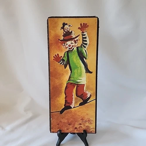 Vintage Signed Diane Dengel 15" X 6" Boy Clown With Puppy 1965 Wooden Plaque
