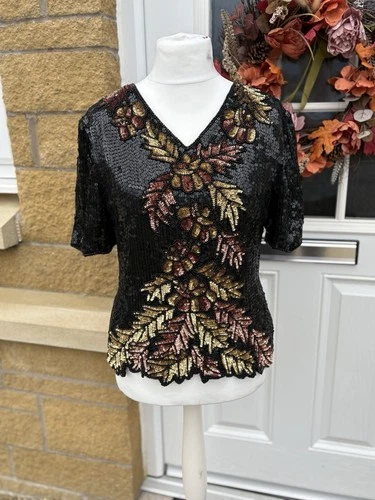 Stenay Vintage Art Deco Style Silk Sequins Black & Gold Ladies Top XL (16-18)