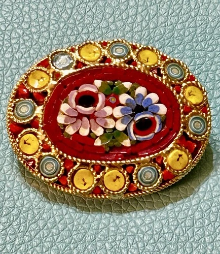 Vintage Mosaic Brooch Pin Floral Yellow Red Brass Plated